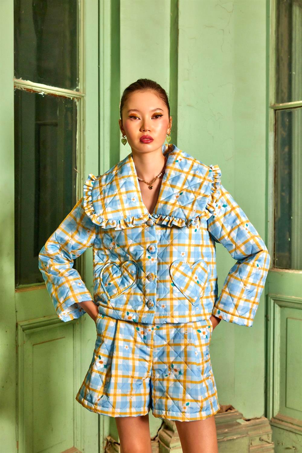Daisy Field Puff Shorts are handmade from tiny daisy-printed puff fabric sprinkled with plaid fabric. Spread the joy with the cute feelings created by the heart-shaped back pockets of the shorts made from high-waisted puff fabric.